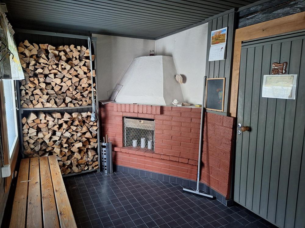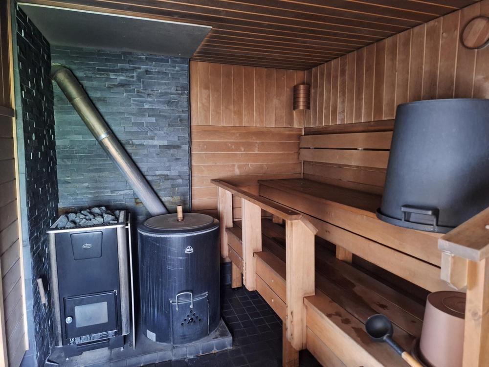 Saunaan mahtuu n. 6 henkilöä kerrallaan. Perinteinen puulämmitteinen kiuas ja kuumavesipata, pesuvati-systeemillä, ei suihkua.